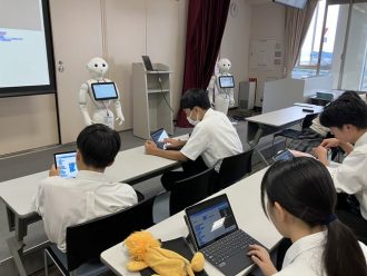 このたび本校に生成AIなどを搭載した人型ロボット、ペッパーが2台(2名?)やってきました! DX補助金を活用した取り組みです。そこで外部講師をお招きして、ペッパーを使ったプログラミング教室を実施しました。各自のタブレットから、ことばや動きなどのプログラムを組み実際にペッパーを動かしてみました。ちなみに、ペッパーはKayちゃんとこうちゃんと名付けられ、毎日フリースペースで生徒とふれあっています。授業参観や保護者集会のほか、学校説明会の日もいますので、会いに来てくださいね!