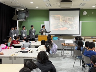 1年間、防災をテーマに学んできた探究クラスの生徒たちが、本校の向かいにある明倫小学校で、小学4年生のみなさんに向けて授業をさせていただきました。