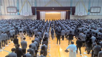 先輩である高2、高3たちも整列しており、新入生を含め、体育館はパンパン状態。緊張の面持ちがまだ抜けない高1学年はきちんと整列し、終始、正しい姿勢で話を聞いておりました。