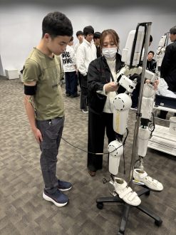 装着型サイボーグHALの説明や、どのようなロボットが実際に活躍しているか、また自分の腕にセンサーを装着させてもらい、実際にロボットの脚を動かしてみるなどの体験をさせていただきました!なかなか苦戦している生徒もいましたが、何回か動かしていくうちにスムーズに動かすことができるようになっていました。